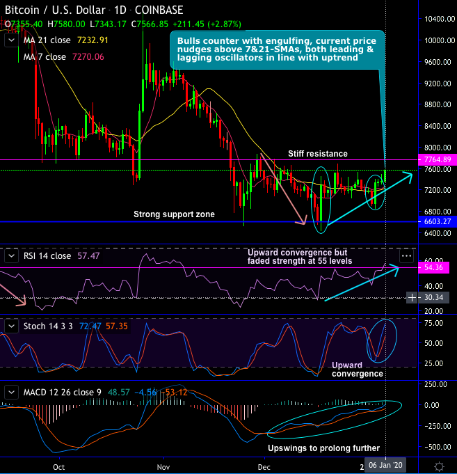 Bitcoin price (BTCUSD) is has been extending rallies above $7.5k levels. Bulls, in the minor trend of BTCUSD, counter with engulfing pattern at $7,285.53 and 7334 levels (refer 1st chart for daily plotting), these bullish engulfing patterns have taken-off rallies above 7 & 21-SMAs, the upswings reclaimed $7.5k levels. Both leading & lagging oscillators are in line with the current uptrend.