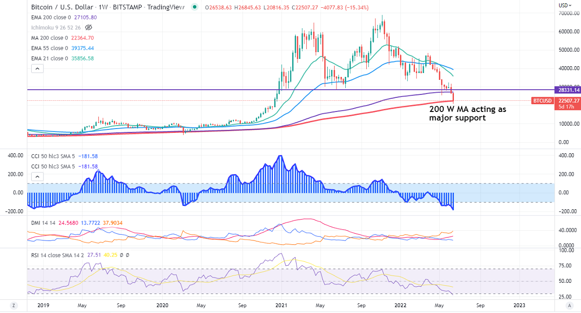 Major support- $22284 (200- W MA). Any weekly close will bring an end to the bullish trend, a dip to $15000/$10000 is possible.