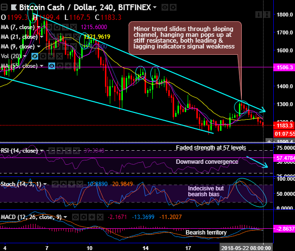 Bitcoin cash (BCHUSD) has dipped below $1,200 levels. While the minor trend of this pair slides through sloping channel, where the hanging man pattern which is bearish in nature pops up at the stiff resistance. Both leading as well as the lagging indicators signal further weakness (refer 4H chart).
