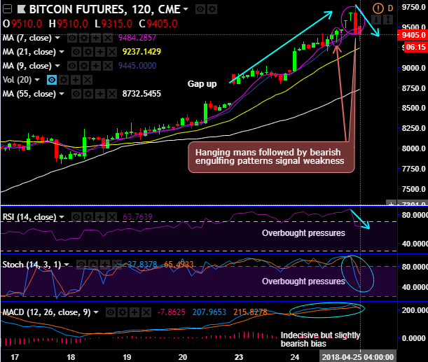 While the hanging man patterns have occurred at 9450, 9580 and 9675 levels followed by bearish engulfing pattern candle has occurred at 9415 levels after the failure swings at 9750 levels (refer 2H chart), consequently, the prices began plummeting below 7DMAs, while both leading indicators seem to be in bears favor.