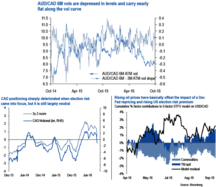 ii) AUDCAD spot and vol tend to be tightly correlated (inversely) during stress, but that spot-vol link is underpriced in risk-reversals that have compressed to near post-global financial crises tights.
