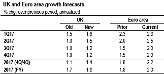 Despite these revisions, our 2017 full-year growth forecast remains slightly below the BoE’s 2.0% forecast. The larger forecast change for the BoE at next month’s Inflation Report likely will be to inflation, where we expect it to raise its existing 4.2% 2017 CPI forecast closer to our current 2.7% projection.