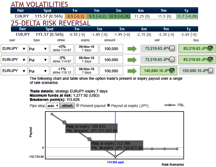 The implied volatilities of EURJPY ATM contracts are shrinking away in 1w tenors after BoJ’s monetary policy, crawling down at 8.5%, but rising above 9.5% and 10.9% in 1-3m tenors respectively. This volatility observation is absolutely suitable for tenor selection in diagonal put ratio backspread.