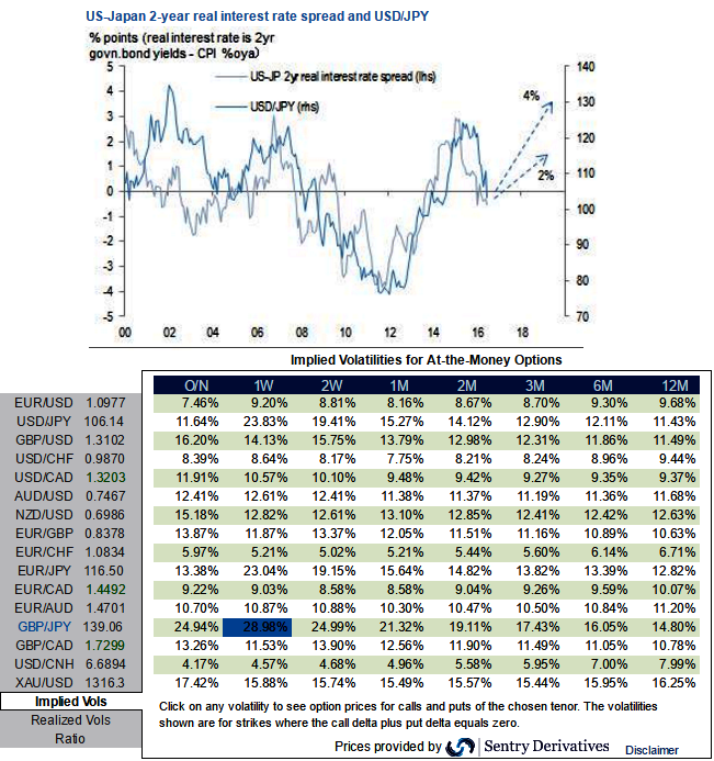 The above chart demonstrates a relationship between US-Japan 2 year real interest rate differential (referring to CPI as a proxy of inflation expectation) and USD/JPY. Based on the past relationship, if Japan’s inflation expectation rises to 2% (4%), USD/JPY would be at 115 (128).