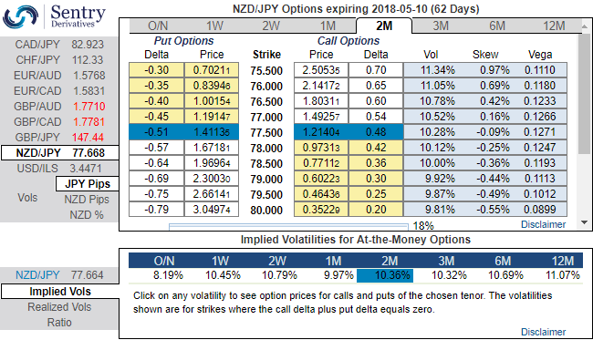 ATM IVs of NZDJPY is trending above 10.30% for 2m tenors and positively skewed IVs of these tenors are evidencing bearish hedging interests. Bids for OTM puts upto 75.50 is noticeable to signify the downside risks which is almost in line with our above-stated projections.