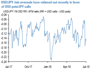 USDJPY 1M 25D risk-reversals currently imply a spot-vol correlation level of around -38%4, which is not a historically high bar for realized spot-vol correlation to beat but is nonetheless expensive vis-à-vis recent delivered numbers (2-wk +25%, 1m +10%) and supportive of skew selling option structures such as put spreads; and
