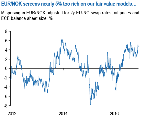Within G10, NOK stands out as an attractive candidate as it still appears cheap relative to rate differentials and oil prices (refer above chart).