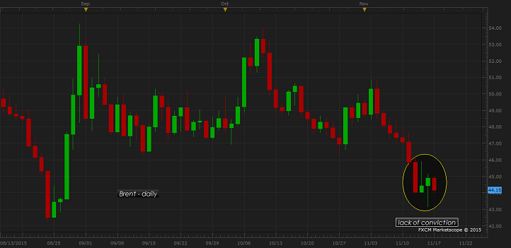 Gains over Paris attack and increased bombing raid might prove limited in crude oil as supply surplus remains too large. Brent, global benchmark of North Sea, might soon resume its downtrend.