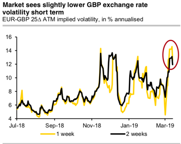 It seems to be slightly perplexed that the 1-week risk reversals in both EURGBP and GBPUSD are trading close to zero. If there was going to be no deal, we have to expect very considerable GBP weakness. It there was to be a delay a risk premium for GBP would still be justified, as a postponed no-deal Brexit does not completely imply (100%) there is not going to be one at all. Everything all told: for all those who consider “no deal” an unacceptable risk, the GBP options market remains surprisingly attractive.
