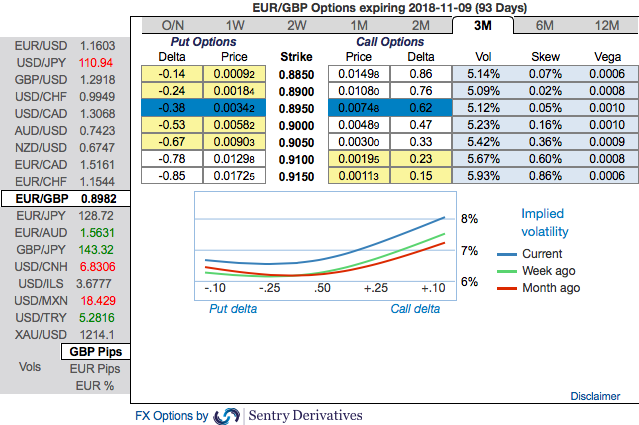 Based on above driving forces, hedgers seem to be factored-in OTC markets. At spot reference levels: 0.8982, please be noted that the positively skewed IVs of 3m tenors are well balanced either side (interests towards both OTM calls and OTM puts) but signify the more hedgers’ interests to bid OTM call strikes upto 91.50 levels (refer above nutshell evidencing IV skews). As you could observe EURGBP forward rates, these derivatives instruments also indicate bullish targets of this pair.