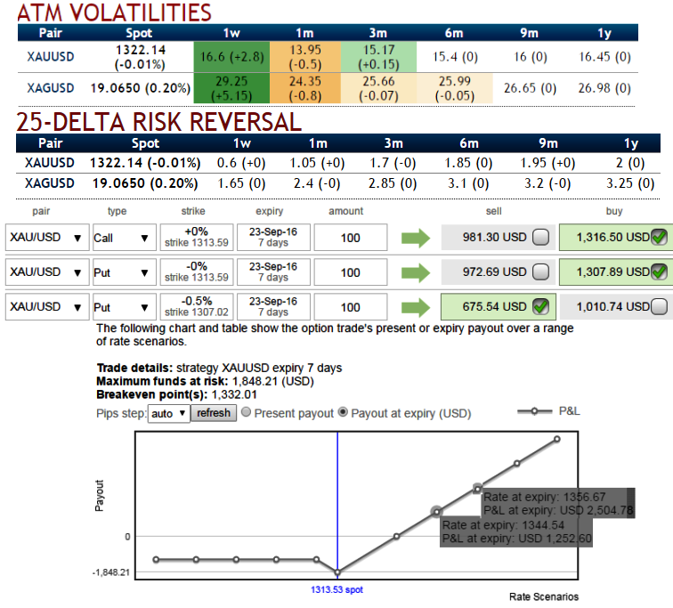 The implied volatility of 1W XAU/USD ATM contracts - 16.6% and 13.95% for 1m tenors.