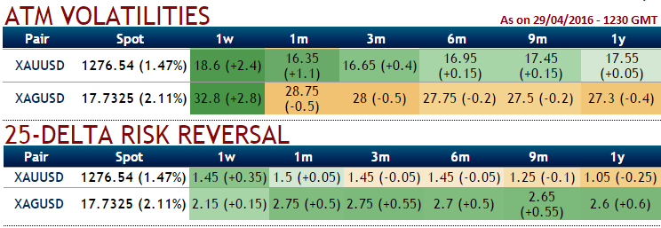 The implied volatility of 1W XAU/USD ATM contracts 18.6% and 16.35% for 1m tenors.