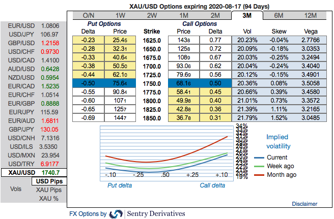 The 3m positive skewness of gold options contracts implies more demand for calls (refer 1st chart). These positively skewed IVs of 3m XAUUSD contracts are still indicating the upside risks, bids for OTM call strikes up to $1,850 is quite evident that reminds us hedgers’ inclination for the upside risks.
