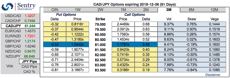 The positively skewed CADJPY IVs of 3m tenors have still been signaling bearish risks, the hedgers’ interests to bids for OTM put strikes up to 79.000 levels indicating downside risks in the medium terms (refer above chart). Please also observe the above technical chart for the major downtrend. Accordingly, we advocated options strips strategy to address any abrupt upswings in short-run and the major downtrend.