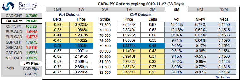 The positively skewed CADJPY IVs of 3m tenors have still been signaling bearish risks, the hedgers’ interests to bids for OTM put strikes up to 77.500 levels indicating downside risks in the medium terms (refer above chart). Please also observe the above technical chart for the major downtrend. Accordingly, we advocated options strips strategy to address any abrupt upswings in short-run and the major downtrend.