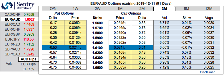 OTC Indications and Options Strategy: Please be noted that IV skews of EURAUD are stretched on either side, the positively skewed IVs of 3m tenors are signifying more hedging interests in bullish than bearish risks. More bids for OTM calls of this tenor indicate that the underlying spot FX likely to spike up to 1.65 levels and bids for OTM puts show 1.56 levels.