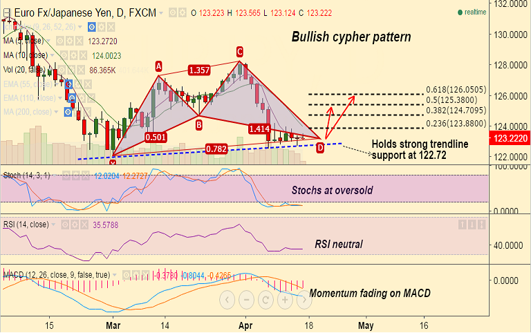 - A Bullish Cypher pattern completed on EUR/JPY daily charts. We see weakness only below 122 levels.