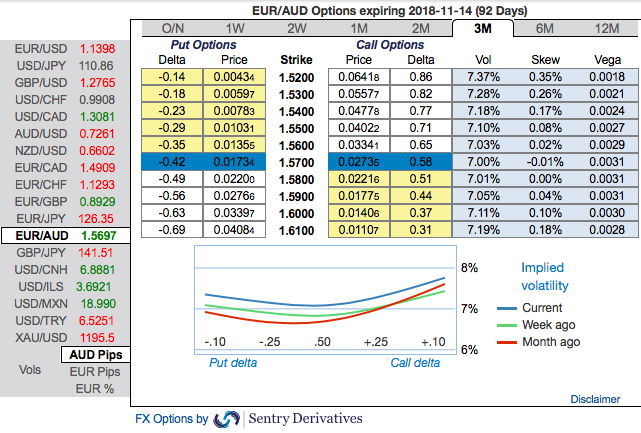 Most importantly, please be noted that IV skews of EURAUD are stretched on either side, the positively skewed IVs of 3m tenors are signifying more hedging interests in both bullish and bearish risks. The bids for OTM calls of this tenor indicate that the underlying spot FX likely to spike upto 1.61 levels and bids for OTM puts show 1.52 levels.