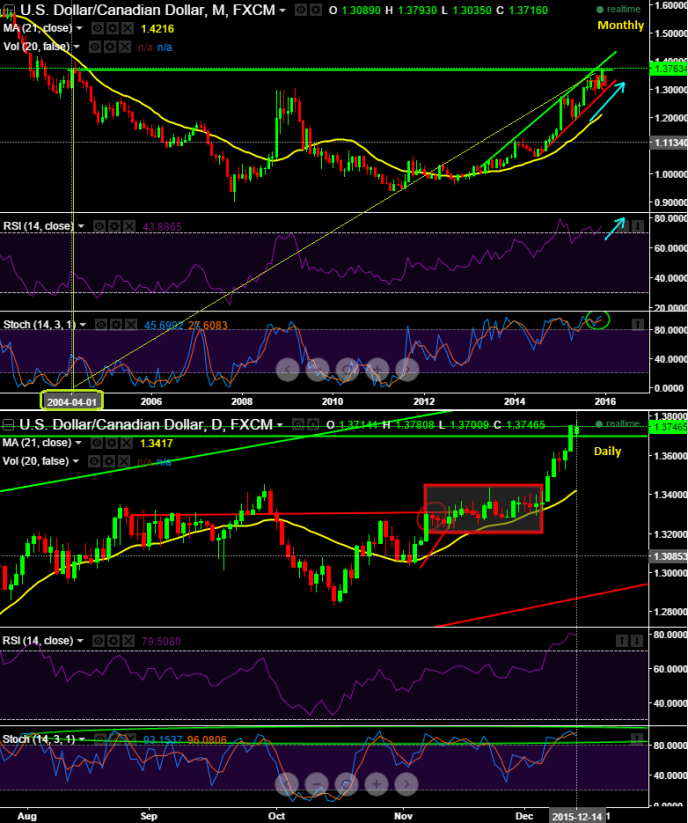 Currently, Loonie has broken psychological resistance levels at 1.3719 levels (i.e. 11 and half years highs) which is way beyond 21DMA.