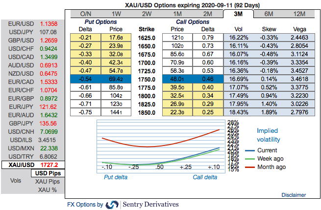The 3m positive skewness of gold options contracts implies more demand for calls (refer 1st chart). These skewed IVs of 3m XAUUSD contracts are still indicating the upside risks, bids for OTM call strikes up to $1,850 is quite evident that reminds us hedgers’ inclination for the upside risks.
