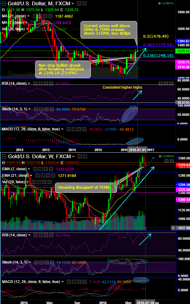 Weekly RSI has been converging downwards with every dip ever since it has dropped from the resistance levels we referred above (1375.04). But this has been adverse to the monthly RSI signals, the leading indicator is still indicating strength in bull rallies.