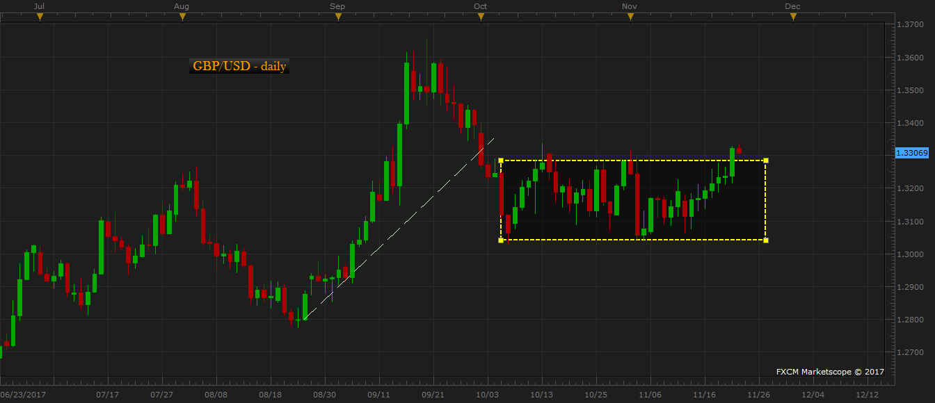 Despite all the above misery, the pound has so far withstood against any bearish pressure and the latest price action suggests that the bulls remain well in charge of the pair. The chart shows that the pair has remained range bound since October. However, it is also important to note the bears have failed thrice since to break it below 1.305 area decisively. Instead, this week, the bulls have broken above the range high.