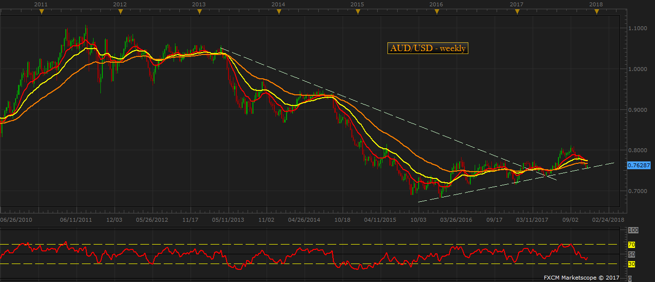 Technically speaking, the chart clearly shows that the Australian dollar, which has been in a downtrend since 2013, has already broken above the downtrend line in February this year. In September this year, Aussie reached a high of 0.806, which was the highest level of the currency since May 2015. It has undergone a correction since but now hovering very close to the rising uptrend line.