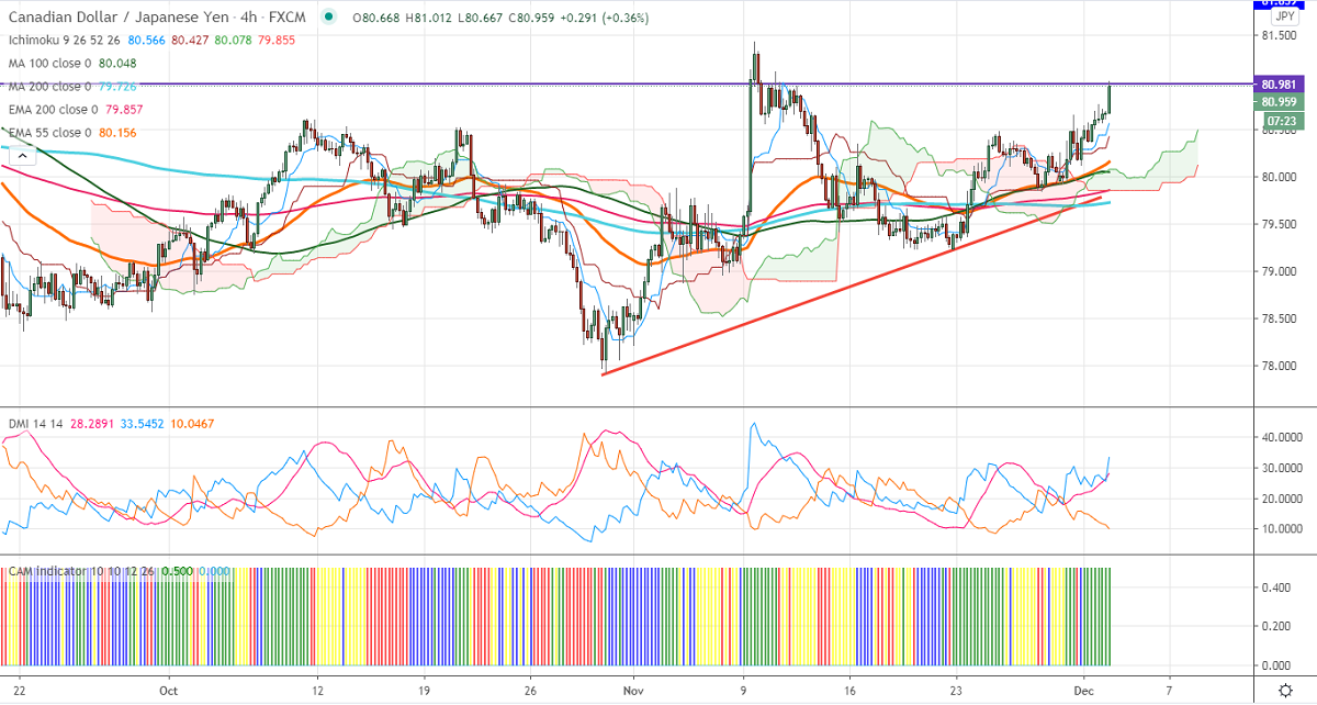 CADJPY is trading higher and jumped nearly 100 pips from yesterday's low of 80.12 on the strong Canadian dollar. The slightly better than expected economic data and surging crude oil prices are supporting CAD. It has grown at an annualized pace of 40% in the third quarter, while Sep Real GDP came at 0.8% vs forecast of 0.9%. USDJPY has shown a minor recovery, significant trend reversal only above 104.75. The overall trend of CADJPY is bullish as long as support 80 holds.