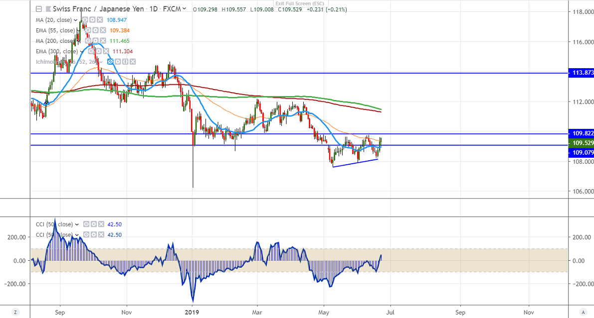 CHJPY is consolidating in a narrow range between 107.61 and 109.78 for the past 7-week. It hits low of 108.21 on Jun 18th 2019 and shown a nice recovery of nearly 140 pips on strong CHF on account of ongoing global uncertainty. The escalation of tension between the US and Iran is increasing demand for Safe-haven assets such as gold, yen and Swiss franc. The pair hits an intraday high of 109.514 and is currently trading around 109.498.