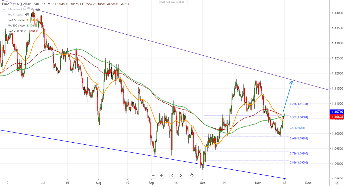 EURUSD has taken support near 61.8% fib and shown a recovery of more than 70 pips. The trade talks that happened during the weekend were constructive and upbeat mood is putting pressure on Safe-haven assets like dollar, yen, etc. It hits a high of 1.10678 and is currently trading around 1.10600.