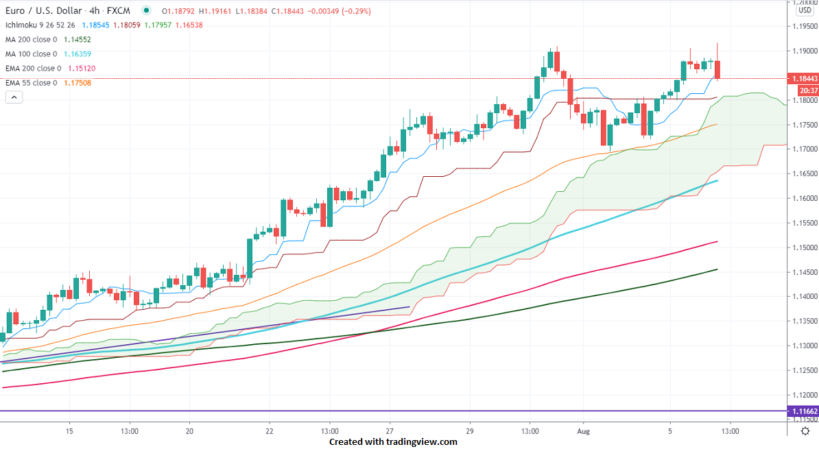 EURUSD has once again declined sharply after a minor jump above the 1.1900 level. The US and China trade uncertainty and the next round of fiscal stimulus are putting pressure on the USD index at higher levels. The dismal US ADP employment has increased the pessimism of US economic growth post coronavirus pandemic. Markets eye US initial jobless claims and Non-Farm payroll data to be released this week for further direction. It hits an intraday low of 1.18384 and is currently trading around 1.18539.