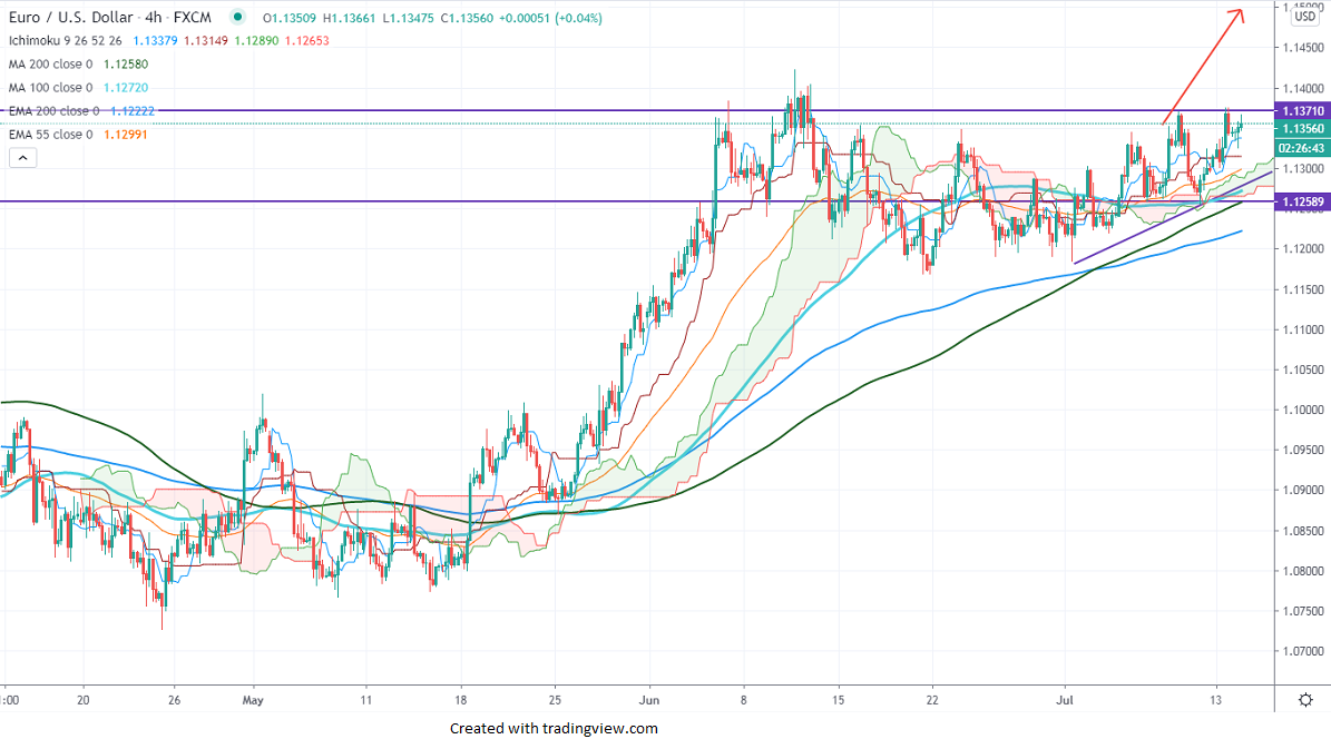 EURUSD is holding above 1.13500 despite weak German ZEW data. The economic sentiment came in at 59.3 vs estimate of 60 while Jul ZEW current situation index at -80.9 vs -65. The COVID -19 treatment optimism is putting pressure on Safe-haven assets like Dollar. It hits an intraday high of 1.13586 and is currently trading around 1.13568.