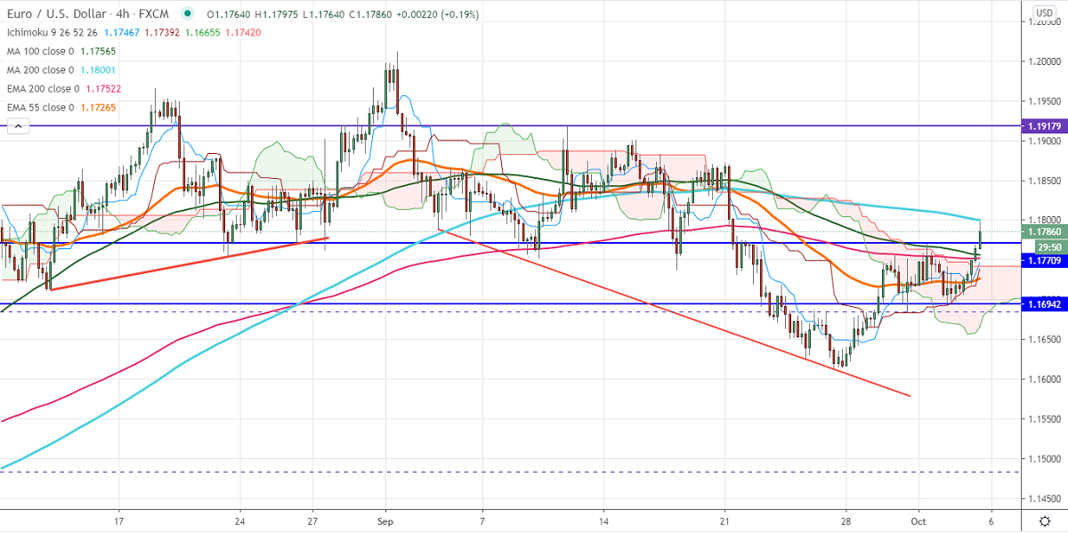 EURUSD jumped nearly 80 pips from a low of 1.17199 in hopes of Donald Trump's discharge. The positive news about the US fiscal stimulus is also putting pressure on the US dollar index. The pair surged till 1.17975 and is currently trading around 1.17877.