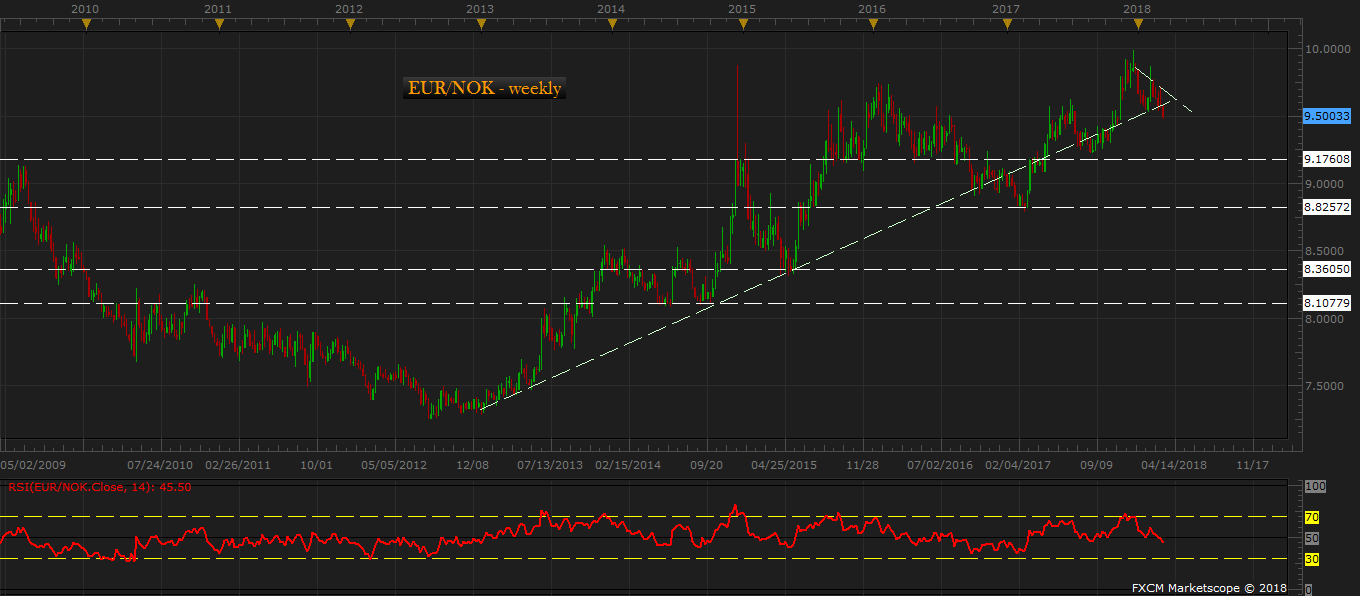Sell EUR/NOK at the current rate of 9.5 with the stop loss around 10 area and with a target of 8.86 area.
