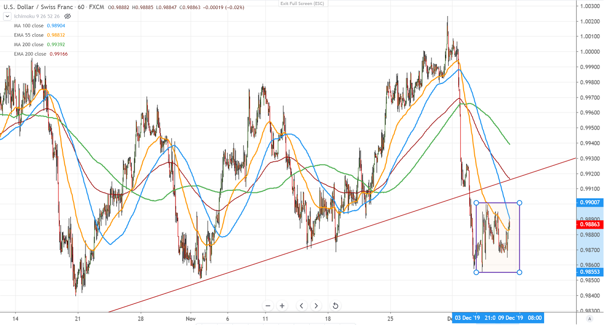 USDCHF is consolidating a narrow range between 0.98552 and 0.98998 for the past two trading days. Any major movement can be seen only after US NFP data. US economy is expected to add 180000 jobs vs 128000 in October, unemployment to remain unchanged at 3.6%. Average hourly earnings to gain 0.3% vs 0.2% previous month. It is currently trading around 0.98857.
