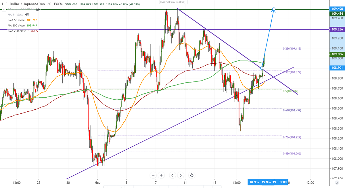 The easing of US-China trade tension has decreased the demand for Safe-haven currencies such as yen, Swiss franc. The Overall trend of USDJPY is bullish as long as support 107.80 holds.