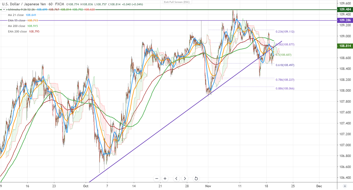 Technically, near term support is around 108.45-50 and any break below will drag the pair to 108.24 (low made on Nov 14th, 2019)/107.80
