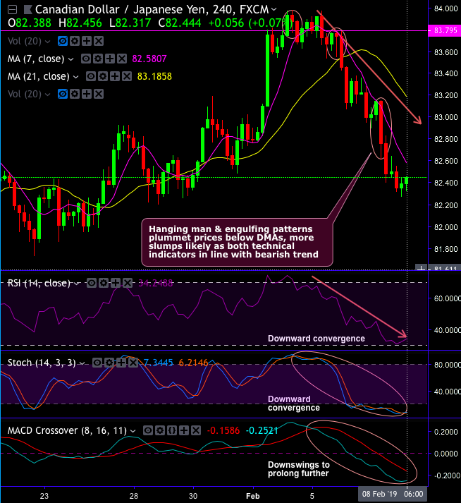 Take a Glance at Technical analysis: CADJPY has been sliding further below 7-DMAs ever since the formation of hanging man and bearish engulfing patterns at peaks of rallies.