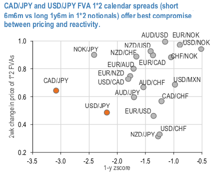 Consider: short 6M6M CAD/JPY @8.7ch vs long 1Y6M @8.55/9.05, in 1:2 vega weights or short 6M6M USDJPY @7.6ch vs 1Y6M @7.55/7.95 indic, in 1:2 vega weights. Courtesy: JPM