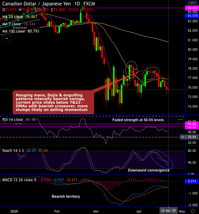 Ever since the formations of shooting star and bearish engulfing patterns at 84.120 and 82.819 levels respectively on monthly plotting, we witnessed steep slumps thereafter. Overall, the major trend seems to be weaker both momentum oscillators (RSI & Stochastic curves) and bearish EMA & MACD crossovers are in bears’ favor.