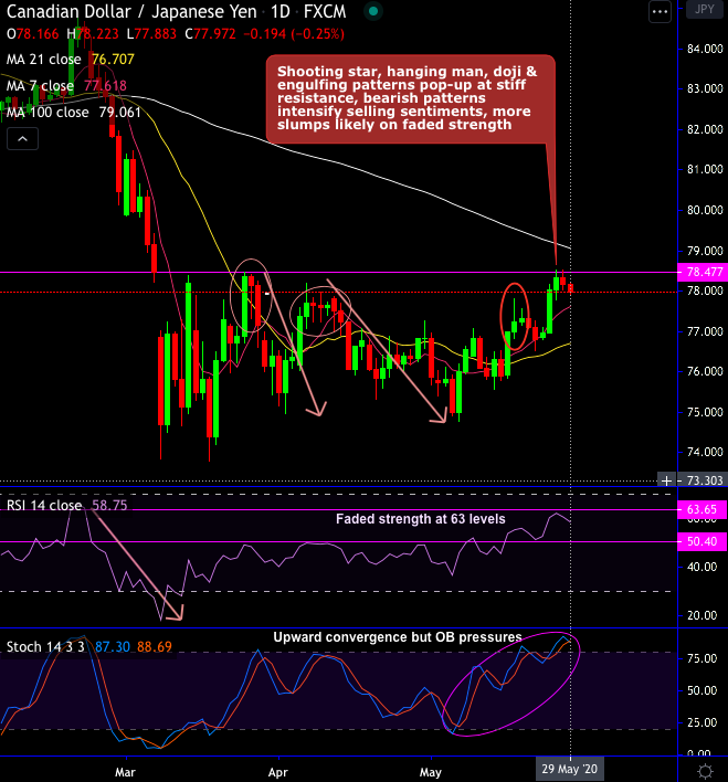 CADJPY’s bears, in the minor trend, are shrugging-off the interim bulls upon failure swings at the stiff resistance zone of 78.500 levels, that’s where hanging man and bearish engulfing patterns pop-up at 77.643 and 77.422 levels respectively. Consequently, the current price attempts to slide below 7-DMAs, the dip below 7-DMA is most likely to resume bearish trend on overbought pressures (refer daily chart).