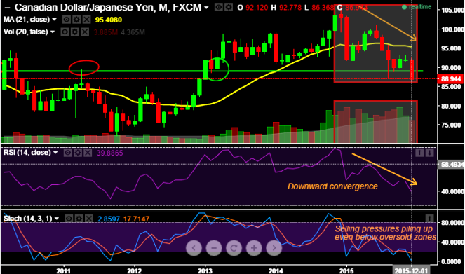 Robust volume build ups in JPY longs and CAD shorts (see grey shaded areas) fortifies bearish trends momentum.