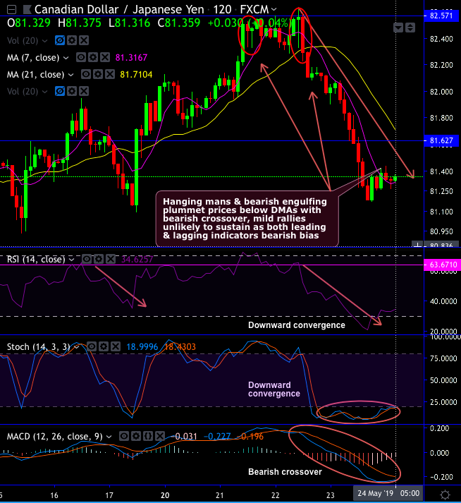 Take a Glance at Technical analysis: CADJPY has slid way below DMAs ever since the formation of hanging man and bearish engulfing patterns at stiff resistance of 82.571 levels.