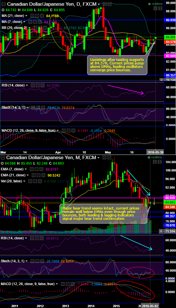 Contemplating intraday bullish sentiments, we recommend on pure speculation basis buying one touch binary calls in order to extract maximum leverage for extended profitability, for targets at 85.132 levels. But in medium terms we could even foresee spot targets at 84.348 and below.