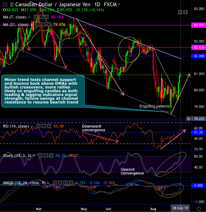 CADJPY has been sliding through the sloping channel (refer daily channel). Bulls have tested channel support and formed bullish engulfing patterns, consequently, bounced back above 7 & 21-DMAs with bullish crossovers in the minor trend of this pair.