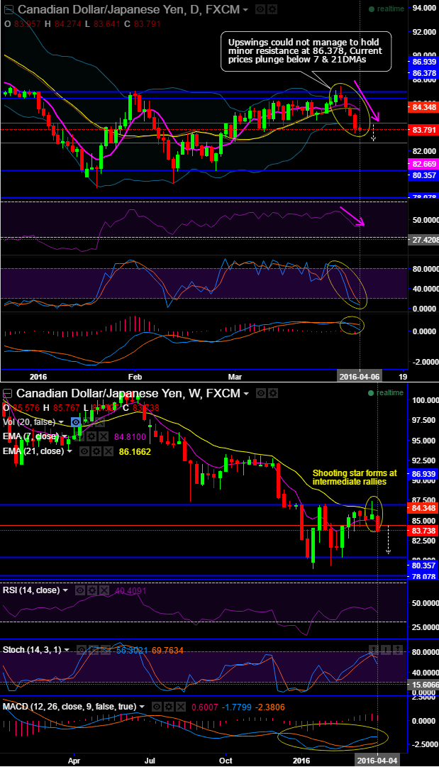 On a broader perspectives, price on weekly drop below 85.1674 levels (21EMAs) and 84.348 decisively has been serving strong bear trend.
