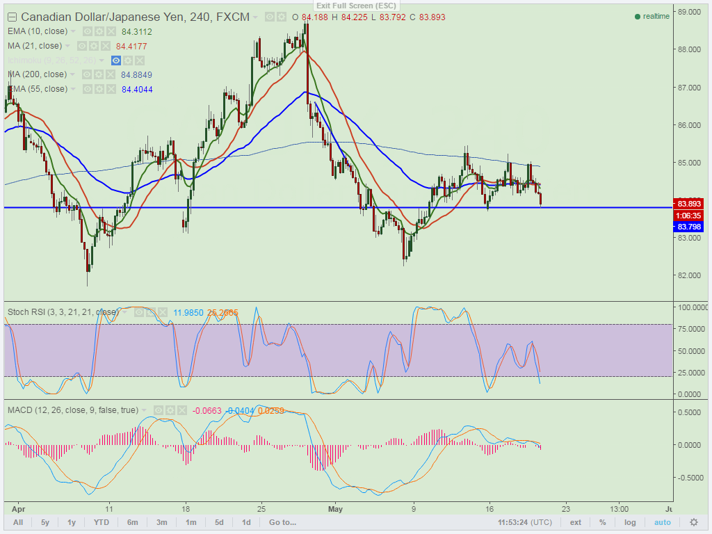 - The pair has broken major short term support 84 and declined till 83.79 at the time of writing .