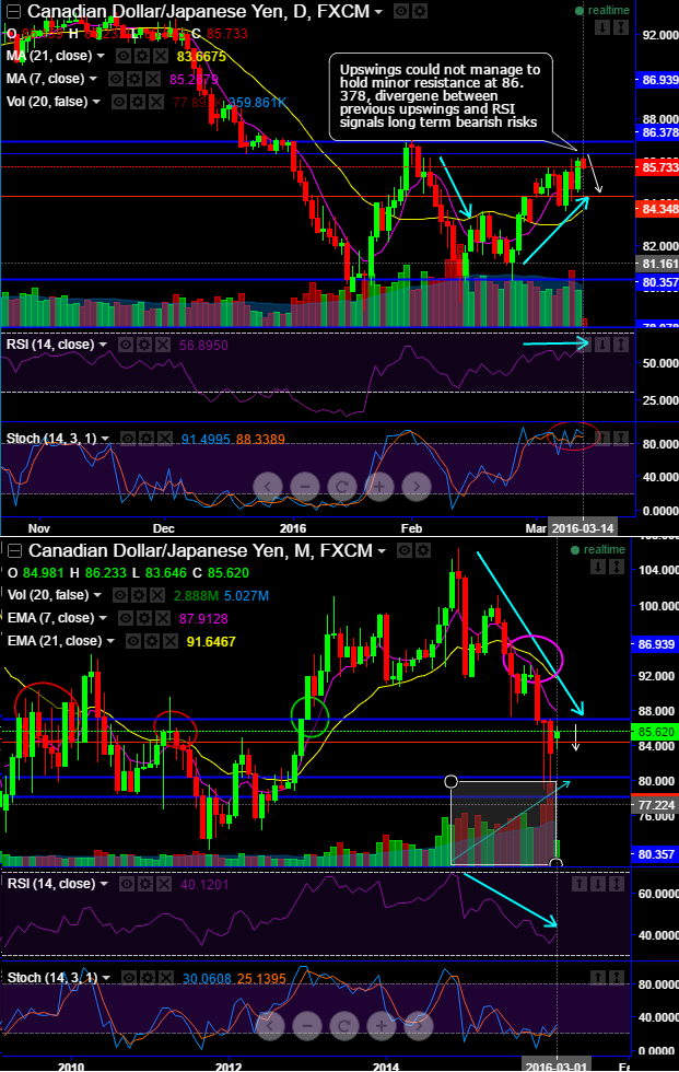 Since, the upswings could not manage to hold minor resistance at 86.378, divergence between previous upswings and RSI signals long term bearish risks.