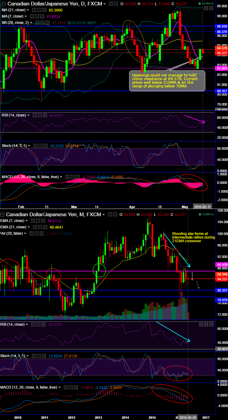 Upswings could not manage to hold minor resistance at 84.578, Current prices well below 21DMA & on the verge of plunging below 7DMA.