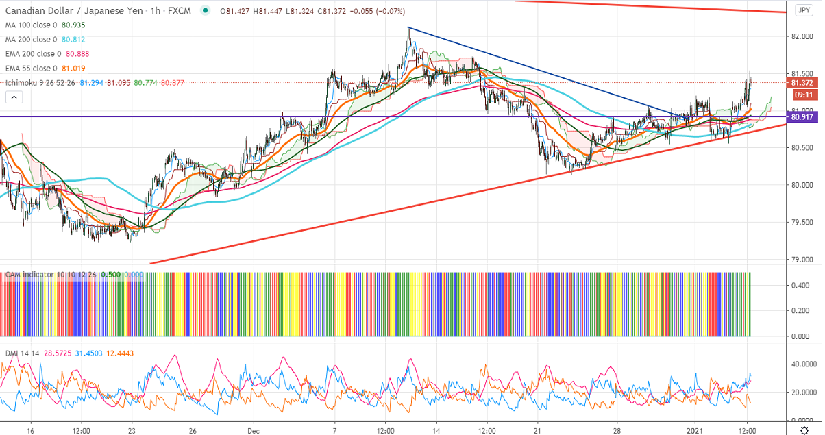 CADJPY is trading higher for 2nd consecutive days on a weak yen. The spread of new stain coronavirus in the UK is putting pressure on the Canadian dollar. USDCAD surged more than 90 pips from a low of 1.2613 on broad-based US dollar buying. Short term trend of CADJPY is bullish as long as support 80.55 holds.